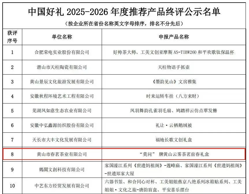 近日,由中国国际贸易促进委员会商业行业委员会主办的“中国好礼产业促进计划2025-2026年度推荐产品”评选活动圆满结束。经严格初审、复评及终评,来自黄山汤口镇的黄山市春茗茶业有限公司旗下“莫问”牌黄山云雾茶·茗前春礼盒脱颖而出,成功入选年度推荐产品名单。