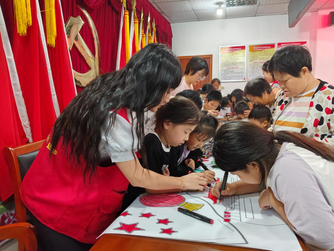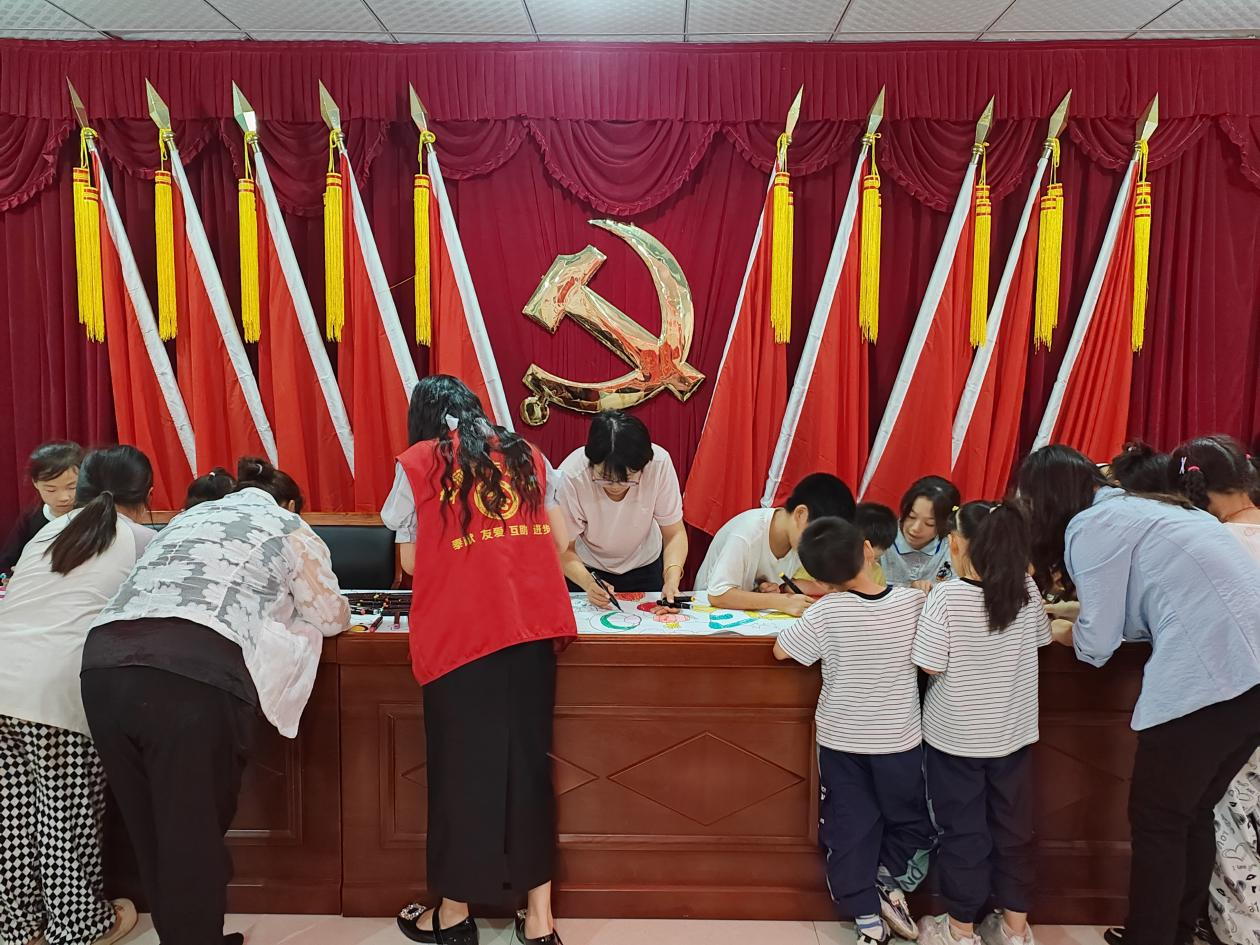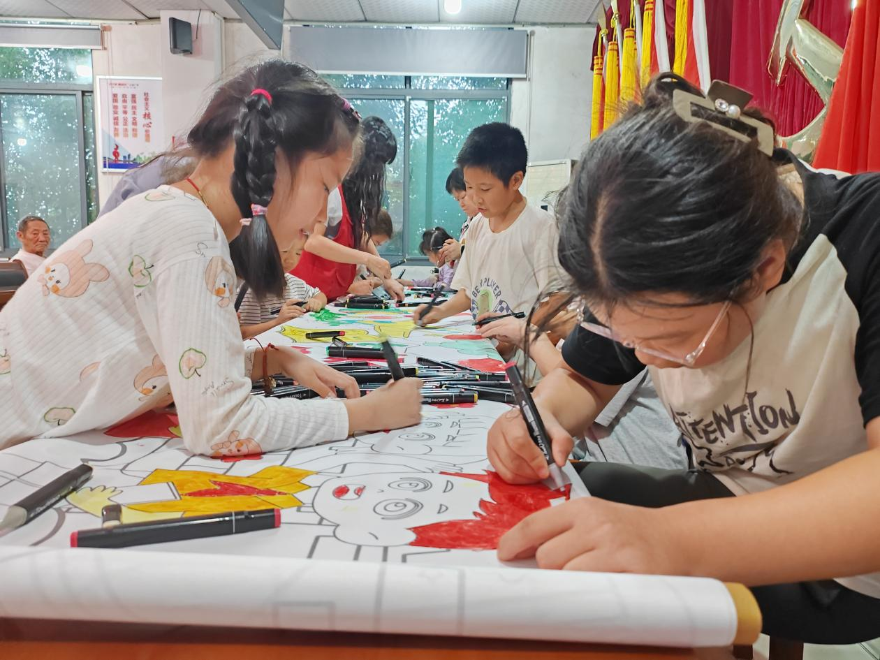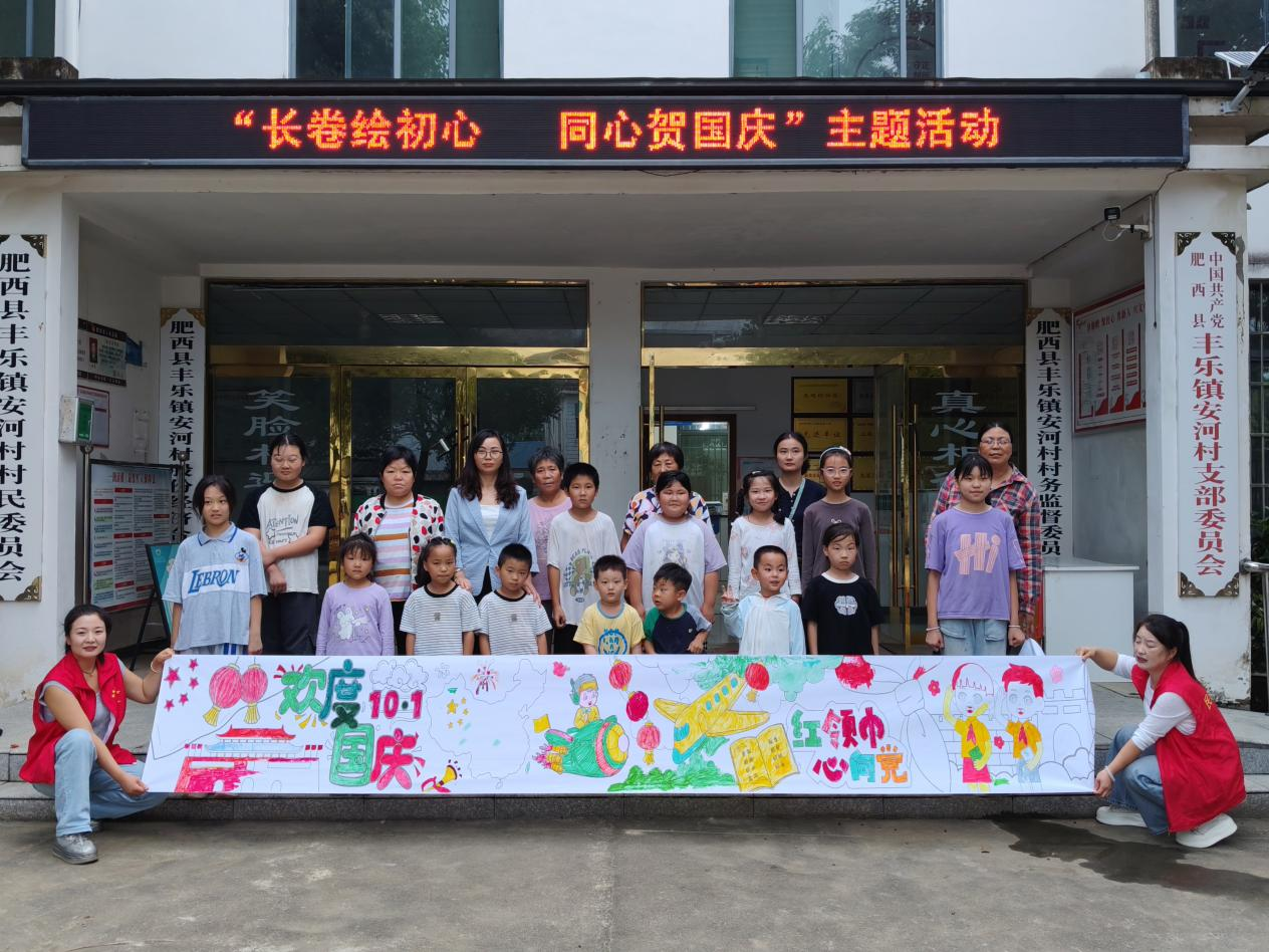 为庆祝中华人民共和国成立76周年,激发广大青少年儿童的爱国情怀,加强村居文化服务建设,9月28日下午,肥西县丰乐镇社会事务服务中心联合丰乐镇文化站、安河村、民欣社工共同开展“我们的节日 国庆节”——“长卷绘初心 同心贺国庆”主题活动。