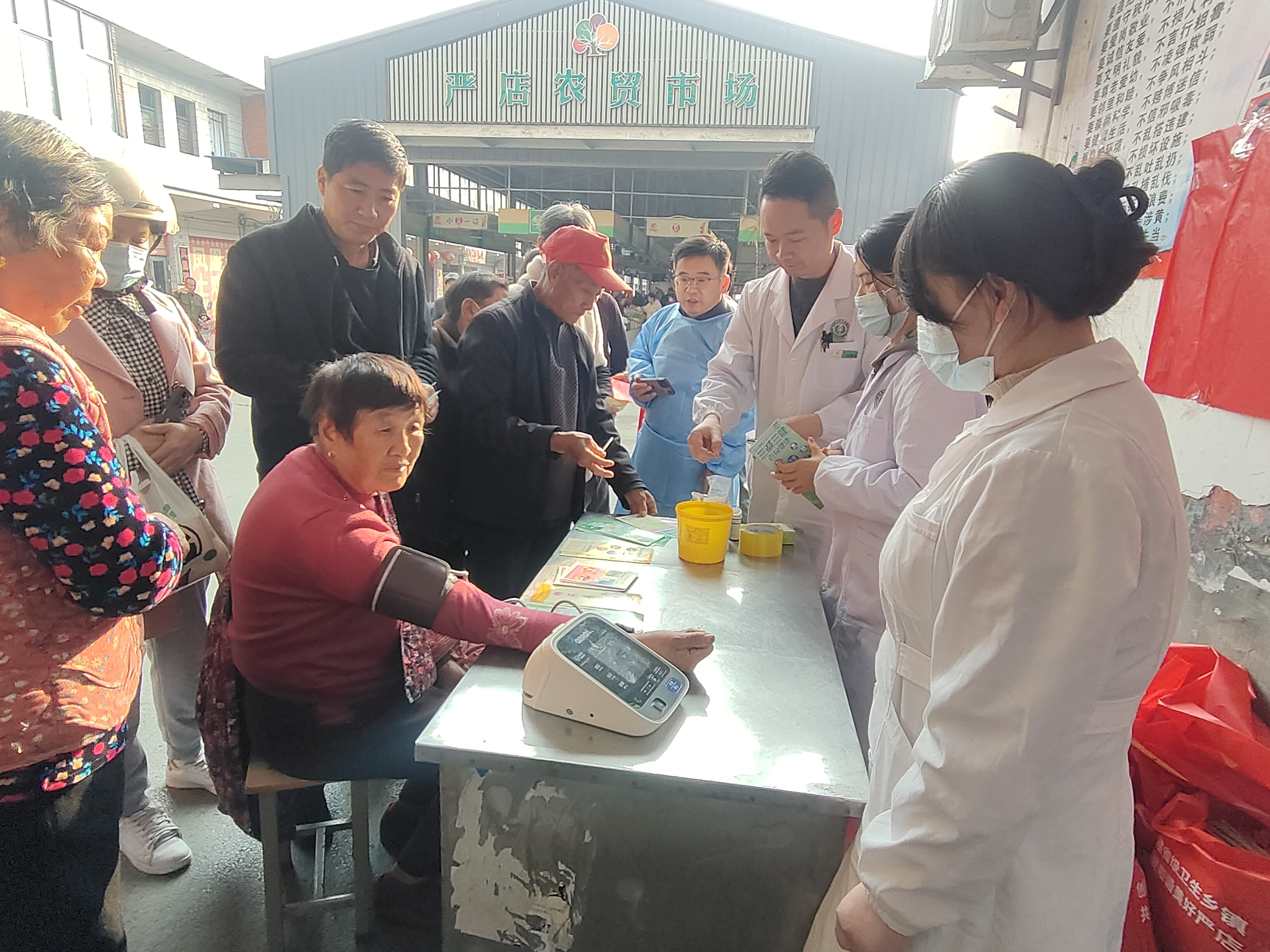 活动现场,由医保服务站工作人员与卫生院医护人员组成的“医保晓宣”志愿服务队,在农贸市场入口人流密集区域设置宣传展台、悬挂宣传横幅、向过往群众发放宣传折页。志愿者用通俗易懂的语言解读2026年医保缴费标准、参保流程、异地就医备案等热点问题,针对新生儿家长关心的“婴幼儿免缴政策及参保流程”和老年群体关注的“高血压、糖尿病门诊报销”等重点咨询事项进行现场解答,让群众对最新政策“听得懂、算得清、用得上”,帮助他们消除疑虑、增强参保意识。卫生院医护人员同步开展免费测血压血糖服务,结合医保政策对现场群众讲解慢性病用药保障措施,引导居民养成“小病早治、慢病规范管理”的健康意识。