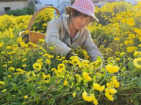 深秋时节,休宁县渭桥乡上演村团结组的菊花田宛如一片金色海洋,朵朵黄菊在暖阳下肆意绽放。村民们穿梭于花丛间,指尖翻飞采摘着饱满的菊花,竹筐在身旁渐渐堆起 “金山”,这幅丰收图景,正是当地菊花产业带动农户增收的生动缩影。