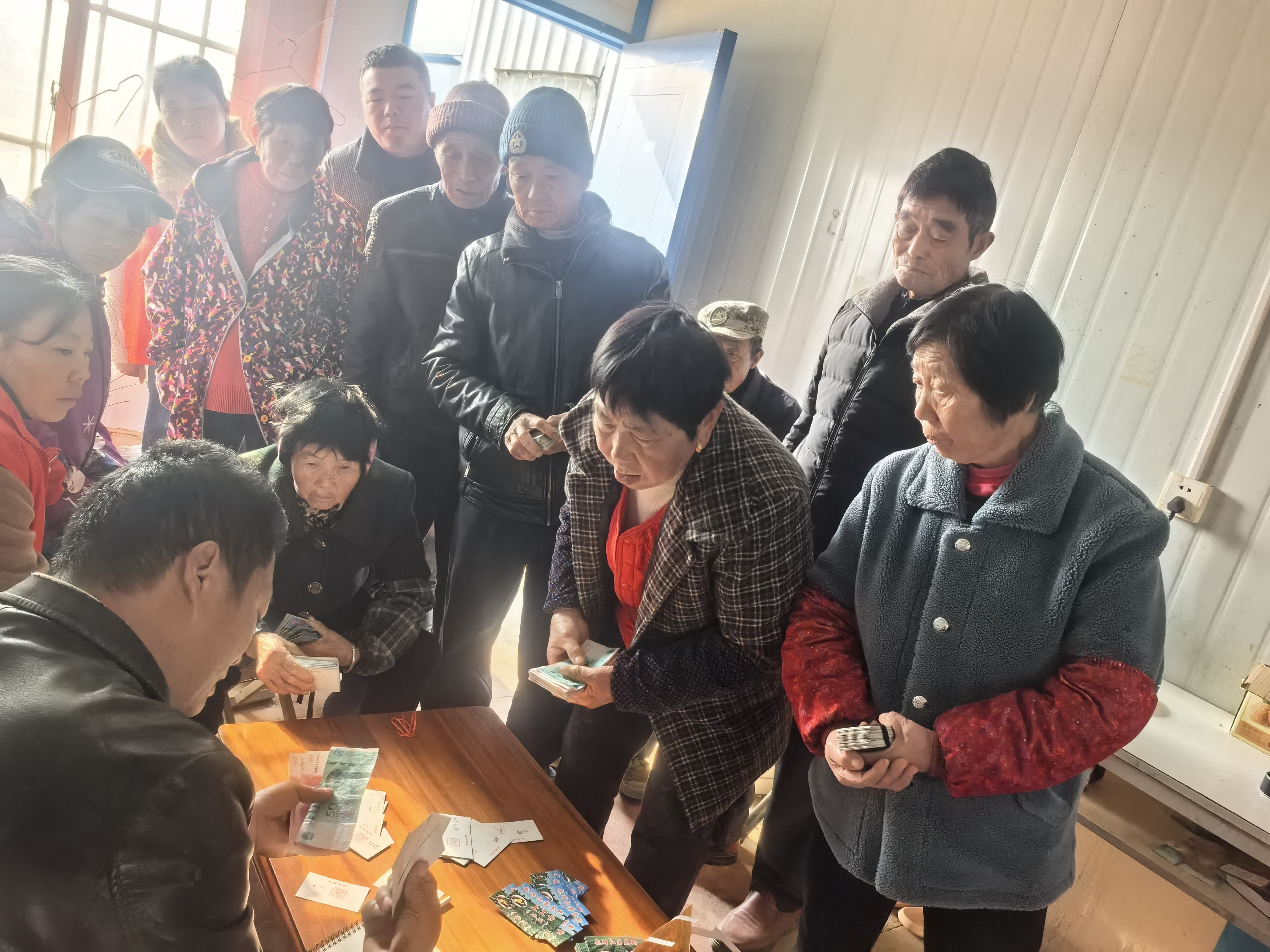 基地负责人赵辉,把账本与现金码得整整齐齐。今天是基地的发薪日。村民们手持上工卡,有序排队等候。赵辉认真核对每一张工卡与出勤记录,将一沓沓现金递到村民手中,并反复叮嘱确认金额。