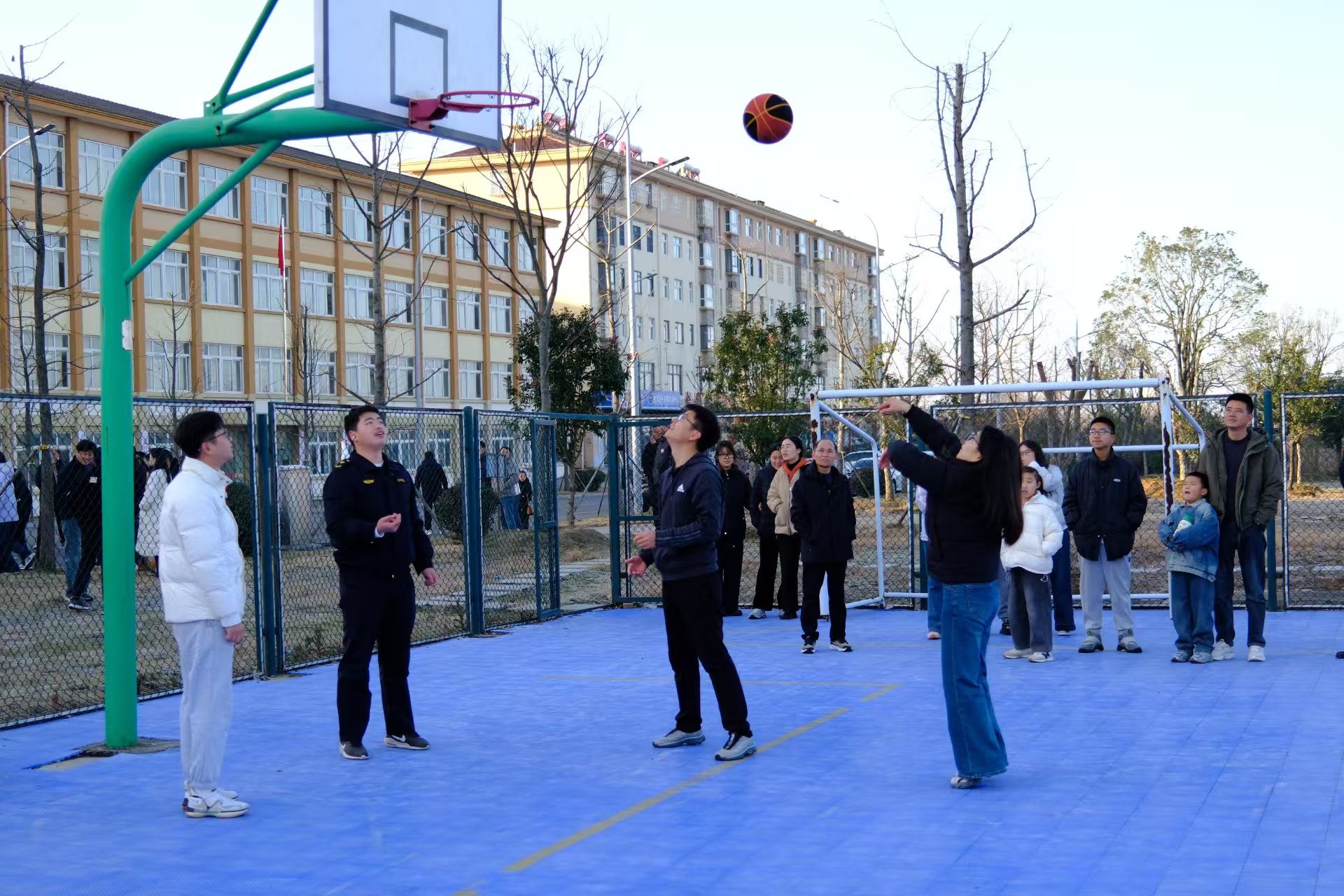 篮球趣味赛中,队员们投篮精准、传递默契。