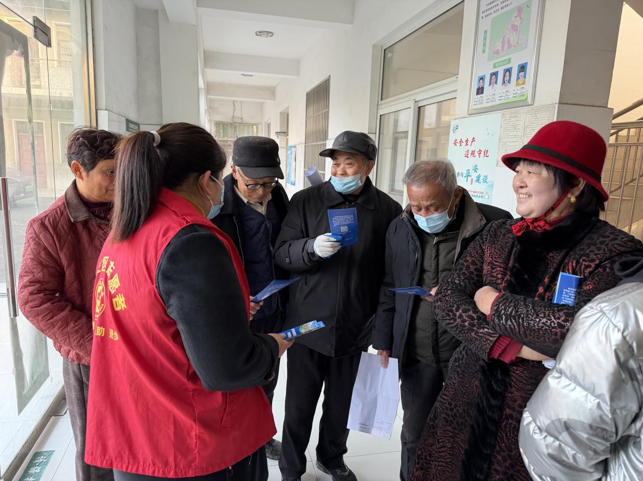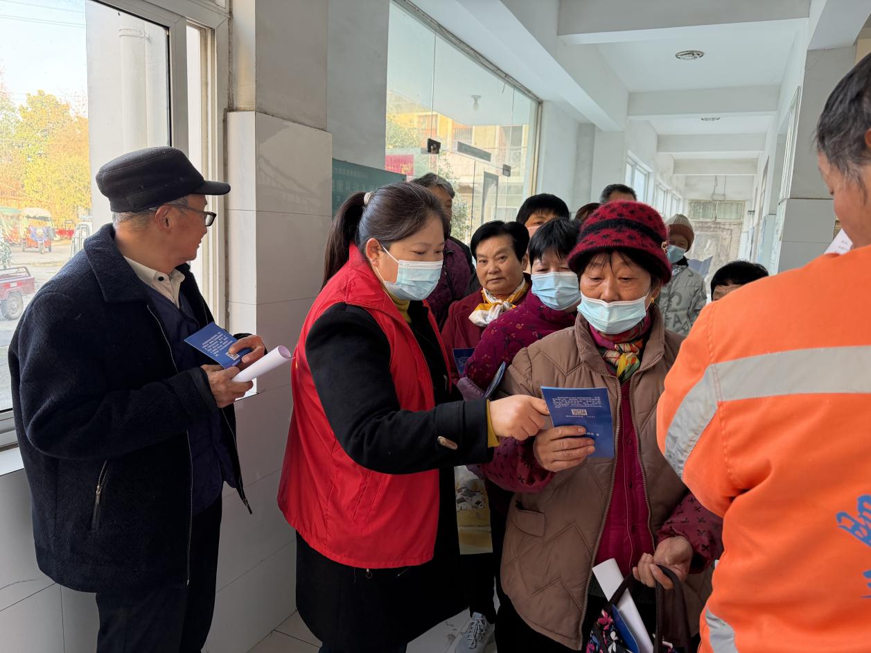 活动当天,程店卫生院内人头攒动,村志愿者们早早到场,分工协作投入服务。在体检等候区,志愿者们通过发放宣传手册、现场答疑等形式,向老年人普及医保缴费标准、报销流程、特殊病种认定等核心政策。针对老年人视力不佳、理解能力较弱的特点,志愿者们“一对一”零距离讲解,用通俗易懂的方言重点说明门诊慢特病报销比例等老年人关心的热点问题。