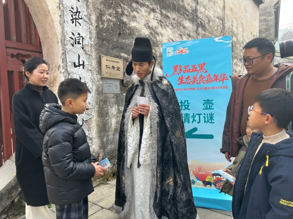 传统大鼓的开幕式后,是一系列可看、可玩、可体验的文化活动。舞龙舞狮队伍穿梭于巷弄之间,与500余名游客和村民近距离互动。身着汉服的展示者或在青石板上漫步,或在里仁亭间驻足,与古村风貌相得益彰。洪星乡此次筹备的十余场活动不仅限于观看,更强调参与,游客和村民们可以亲手写下对新年的祝福,在专业指导下尝试投壶等传统游戏,或依据线索在村落中进行探索寻宝。这些设计让静态的历史建筑与动态的人文活动有机结合,使文化体验从“旁观”转向“沉浸”。一位带着孩子参加寻宝活动的家长说:“这样边玩边学,孩子记得特别牢,比光看书有意思多了。”