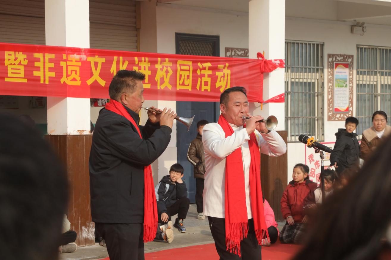 活动还特别安排了丰富的非遗文化展演环节。省级非遗“夏派唢呐”传承人周志民、张永飞带来经典曲目《百鸟朝凤》,精湛的演奏赢得阵阵掌声。周志民现场讲解了“夏派唢呐”的历史渊源与艺术特色,并向学校及学生代表赠送书籍《夏派唢呐研究与传承》,鼓励同学们了解非遗、热爱传统。县戏剧曲艺家协会副会长江艳献唱黄梅戏《女驸马》选段,周陈村谢姐鼓舞队表演了富有感染力的鼓舞节目。现场同时穿插了舞狮、骑犟驴等民俗表演,台上台下互动热烈,校园内洋溢着浓厚的文化气息。
