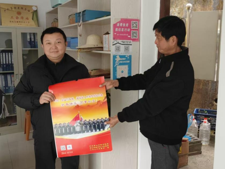 近日,黄山市徽州区洽舍乡联合各村退役军人服务站开展新春送挂历活动,乡村两级工作人员组成慰问小组,逐户为全乡退役军人及优抚对象送上新年挂历。