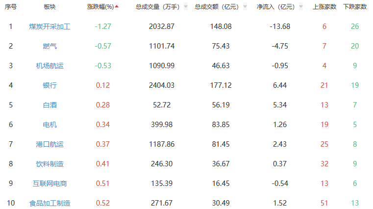 行业板块方面,工程机械、橡胶制品、房地产等板块涨幅居前,煤炭开采加工、燃气、机场航运板块下跌。