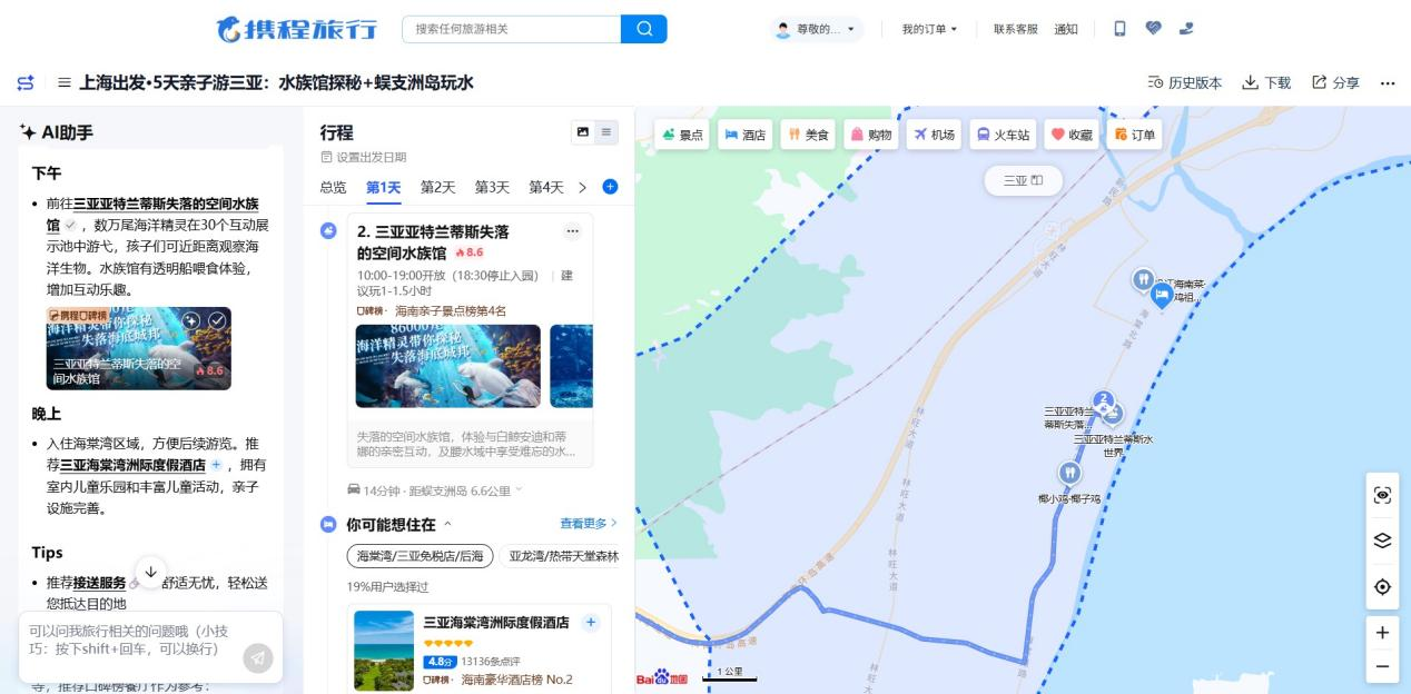 “以前给孩子和老人订行程,光是协调航班时间就得反复查资料,生怕红眼航班影响休息,酒店选不好还要担心设施不适合。”上海市民李女士的困扰,也是许多家庭出游时常遇到的问题。记者以“上海至三亚5日家庭游”为例,使用携程AI行程助手输入出行日期与人员构成,系统结合实时数据推荐了上午直飞航班,减少红眼航班对老人与孩子的困扰,并自动匹配机场至酒店的最优接送方案。根据携程口碑榜真实用户评价,AI行程助手还优先推荐了三亚湾一线海景亲子酒店,包含儿童俱乐部、家庭泳池和长者专属早餐等,充分考虑到阖家出游人群的需求。
