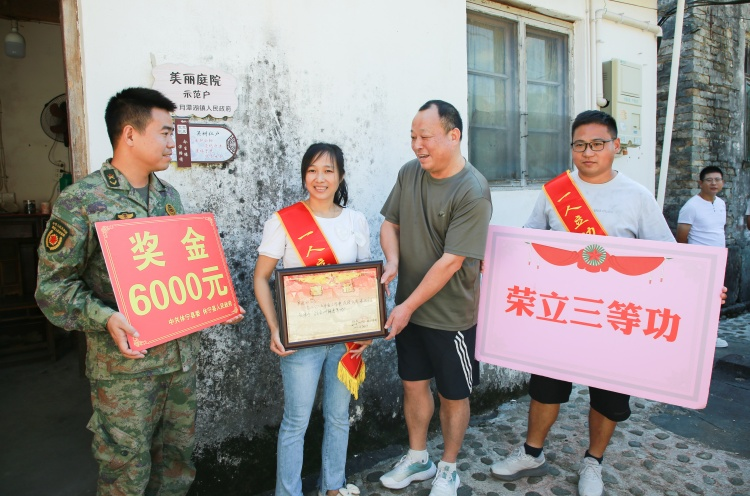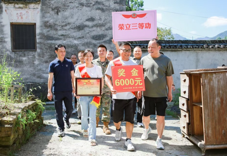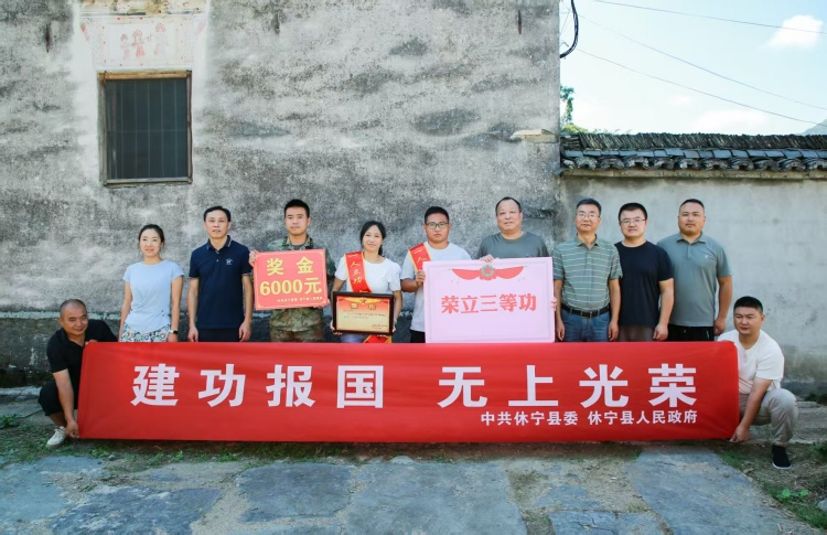 9月22日上午,休宁县月潭湖镇泮路村锣鼓喧天、喜气洋洋,伴随着欢快的锣鼓声和鞭炮声,休宁县人武部、退役军人事务局及月潭湖镇党委政府和泮路村两委工作人员来到现役军人吴近昭家里,为其家人送上三等功喜报和慰问金,并与其家庭合影留念,分享军功荣誉。
