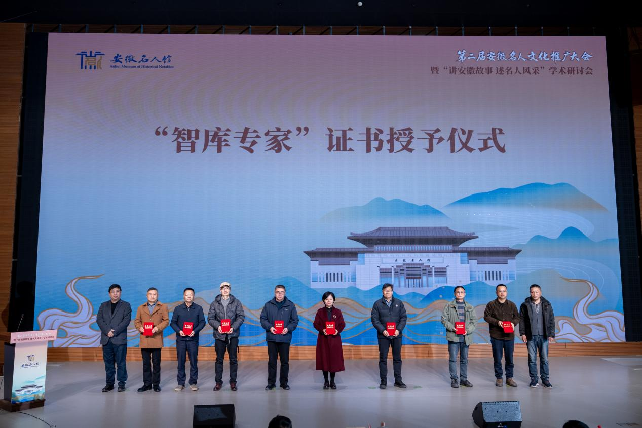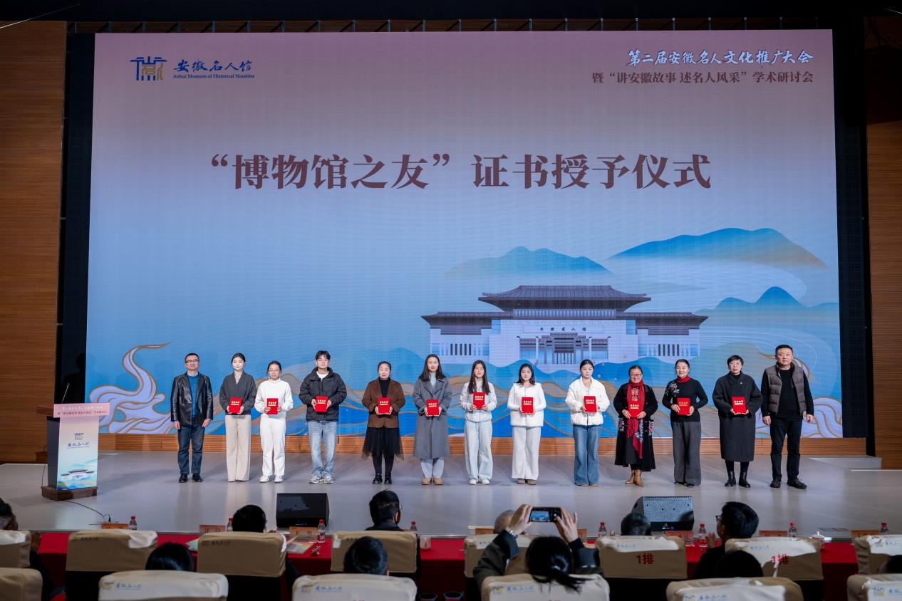 会议现场,隆重举行了“讲安徽故事 述名人风采”征文比赛颁奖仪式,本次征文活动自启动以来,受到社会各界广泛关注,共收到来自全省文博爱好者、高校师生、研究者及文化工作者等投稿作品104篇,经过严格评审,最终评选出优秀奖10人、三等奖6人、二等奖3人、一等奖1人。安徽省社科联二级研究员翁飞为获奖代表蒯正聪、吴梦媛、董宇浩颁发荣誉证书。会上,合肥市文化和旅游局二级调研员李玉海、安徽博物院(安徽省文物鉴定站)副院长卞坚为渡江战役纪念馆、安徽名人馆新聘智库专家代表颁发聘书,专家们将作为智囊团,为安徽名人馆未来的学术研究、展览策划、教育创新及长远发展提供高层次、专业化的智力支持。此外,渡江战役纪念馆(安徽名人馆)管理处副处长汪炜和彭飞为“博物馆之友”代表授予证书。这批新成员的加入,将进一步拓宽博物馆的社会参与渠道,增强博物馆的文化辐射力与公共文化服务能力。