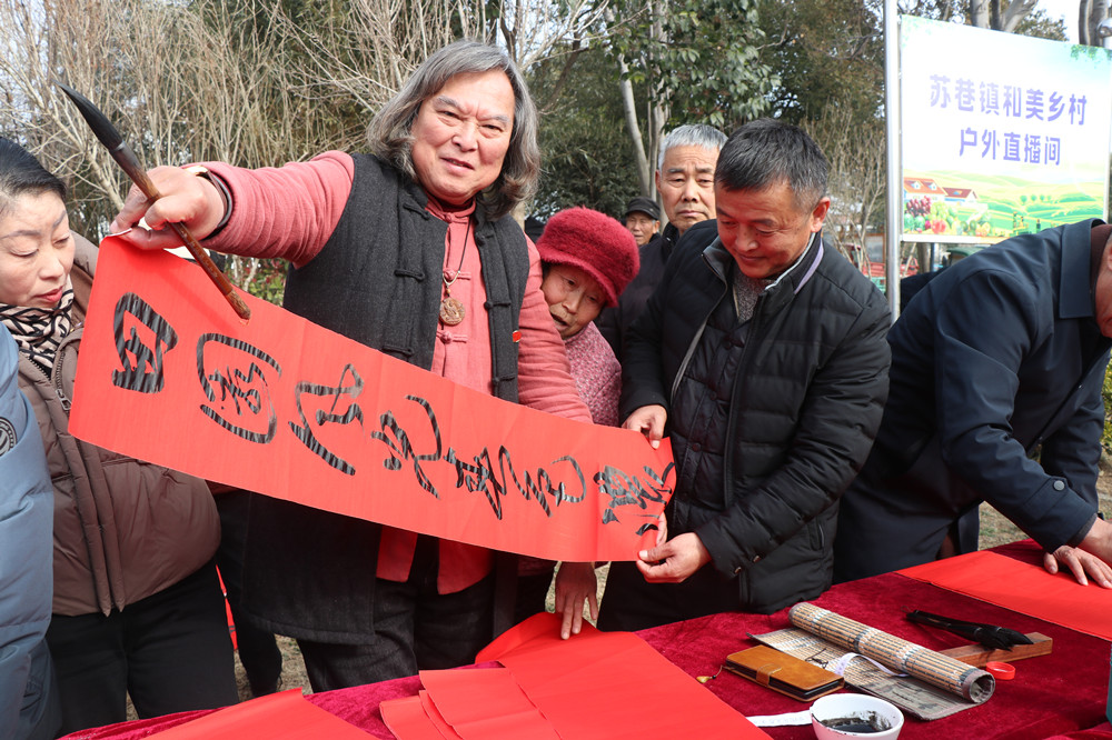 村民张莹在墨香四溢中,第一个来到现场,对写春联的胡正良说:“如今,苏巷镇和美乡村建设得真漂亮,请给我写一副赞美的对联。”胡正良心领神会,饱蘸浓墨,大笔一挥,一副苍劲有力的“和美乡村美如画,幸福家园春满园”对联,映红了他的笑脸。