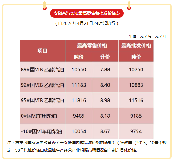 根据国家发展改革委通知,2026年4月21日24时起,成品油价格下调,安徽省同步实行。调整后92号汽油为8.40元/升,95号汽油8.98元/升,0号柴油8.18元/升,按一般家用汽车油箱50升容量估测,加满一箱92号汽油约少花22元。