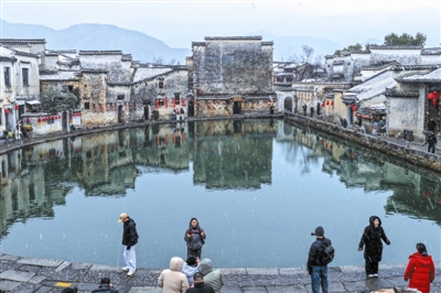 2026年1月20日,世界文化遗产地安徽省黄山市黟县宏村古村落雪景如画,粉墙黛瓦的徽派民居覆上新雪,宛如一幅徐徐展开的静谧水墨画卷,展现出冬日宏村独有的诗意与韵味。施亚磊 方龙 文/图