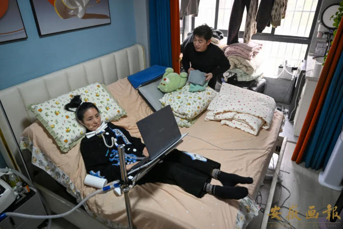 如今,他们靠眼控仪和眼神交流:屏幕上跳出的一行行文字,翟金龙在一旁悉心解读。每个深夜,待妻子安然入睡后,翟金龙都会刷遍病友群和最新的医疗资讯,对渐冻症治疗的每一个新名词、每一条新进展都熟稔于心。“我个人最看好的是干细胞和脑机接口技术,特别关注和期待。”他眼中闪着光。前不久,夫妻俩第一时间刷到合肥脊髓电刺激手术的消息。“这些病友很勇敢,临床是有风险的。但如果有合适的机会,我们也愿意试一试。”
