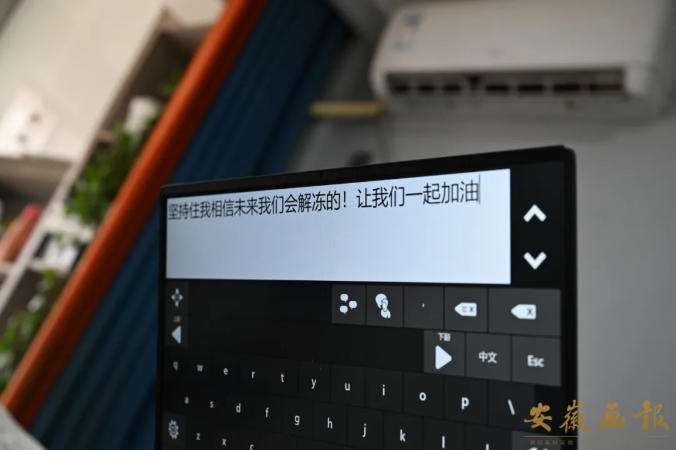 问及想对渐冻症病友说些什么,魏云静通过眼控仪在屏幕上敲出“坚持住我相信未来我们会解冻的!我们一起加油!”