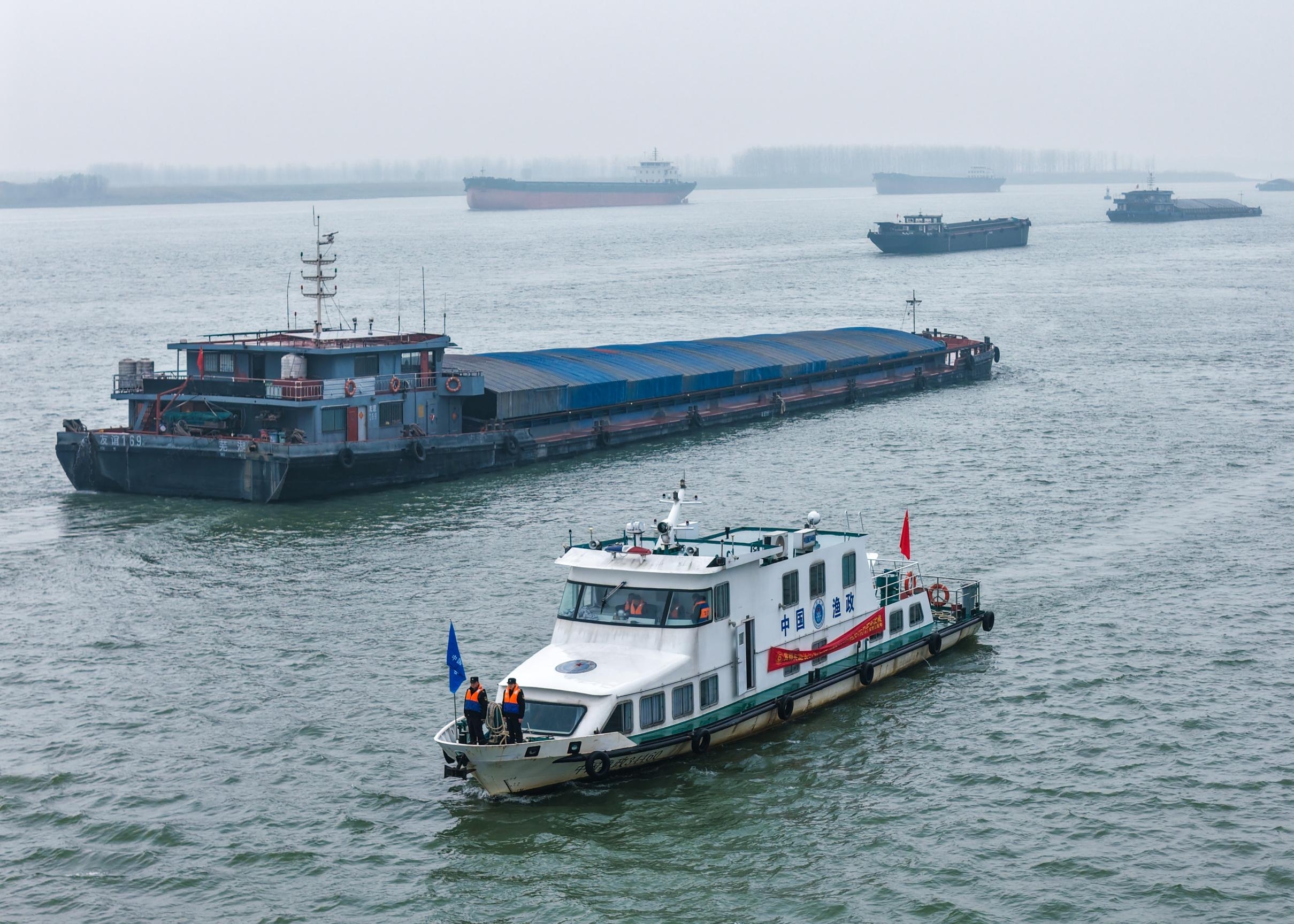 3月20日,芜湖市繁昌区水政、渔政等部门工作人员在新港镇长江段水域开展联合执法巡逻,守护长江生态防线。