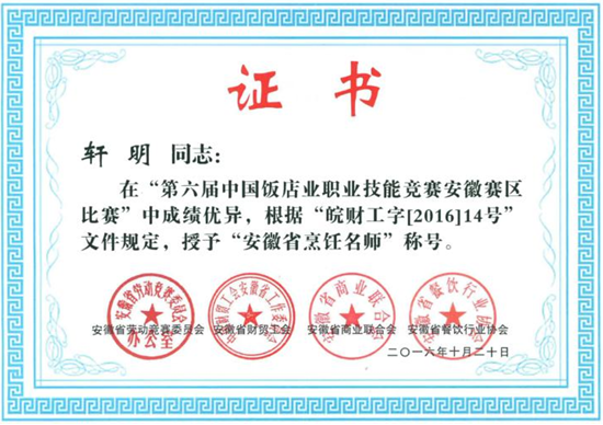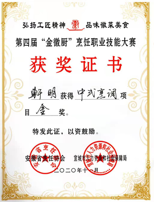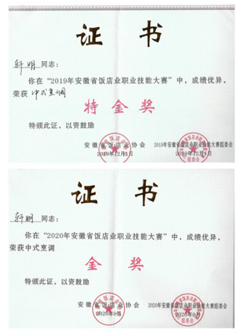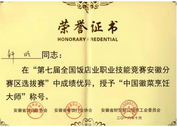 凭着扎实手艺,他参与拟订安徽省地方标准《公筷、公勺使用规范》,主创中国徽菜宴、新安养生宴等六大主题文化宴席,在省级以上烹饪大赛中屡获金奖、特金奖,先后获评“中国徽菜烹饪大师”“安徽工匠”等称号。