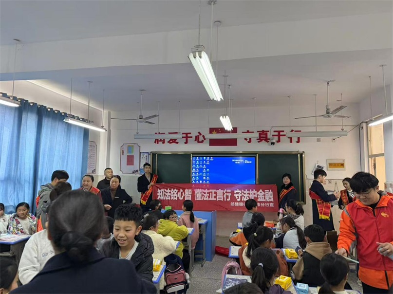 “知法铭心智,懂法正言行,守法护金融”——这条鲜红的普法横幅,跟随邮储银行阜阳市分行宣传队的脚步,先后亮相于阜阳市颍东区插花镇居委会和袁寨镇中心小学的校园课堂。横幅不仅是视觉的焦点,更成为普法宣传的精神旗帜,吸引群众和学生驻足研读,将法治的核心理念悄然融入日常生活。