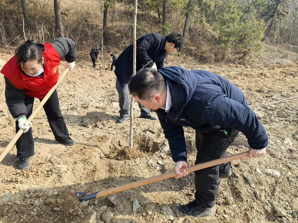 活动现场,春日的林场满目生机。在林场工作人员的专业指导下,大家分组协作、干劲十足,挥锹铲土、挖坑扶苗、培土踩实、提水浇灌,每一道工序都有条不紊、一丝不苟。汗水浸湿衣衫却难掩热情,青年们分工明确:有的默契配合扶稳树苗,有的细心填充土壤,有的认真浇灌定根水,林间处处涌动着忙碌而有序的身影,奏响了春日植绿的劳动乐章。