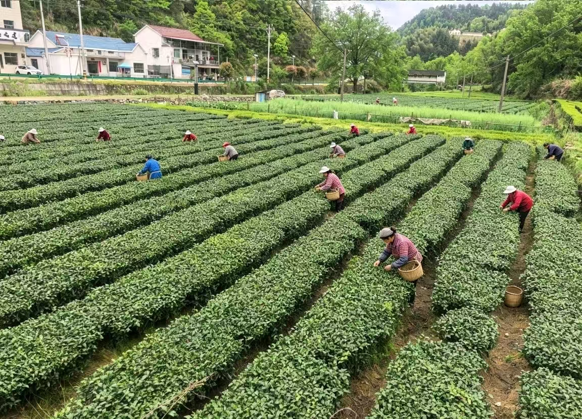 不远处的茶山间,村民伴着清晨的露水在茶树间指尖翻飞,将春日最嫩的芽尖采入竹篮,每一片鲜叶都凝结着茶农的辛劳,为这份增收的喜悦源源不断注入新的生机。太湖县立足生态优势,将茶叶种植作为富民兴村的特色产业,从茶园管护到鲜叶交易,从手工炒制到品牌培育,一条完整的茶产业链正逐步成型,让“一片叶子”真正成为带动村民增收、推动乡村振兴的“金叶子”。