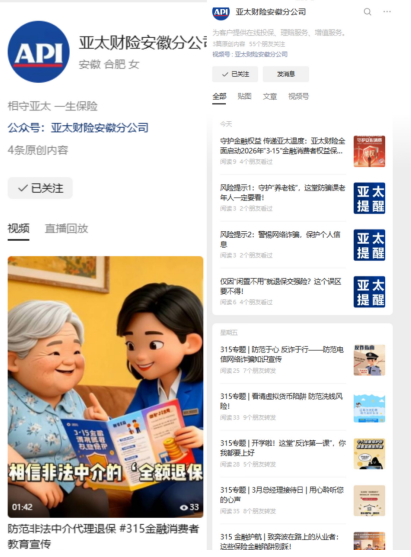 在积极开展线下活动的同时,亚太财险安徽分公司充分利用线上渠道扩大宣传影响力。通过微信公众号、视频号先后发布了“315金融护航 | 致奔波在路上的从业者:这些保险金融陷阱别踩!”“风险提示:守护‘养老钱’,这堂防骗课老年人一定要看!”“警惕网络诈骗,保护个人信息”等多篇风险提示微文,以及“防范非法中介代理退保”动画视频。这些内容以图文、动画等形式生动揭示不同场景下的金融风险,让更多消费者便捷获取实用的金融消费安全知识。