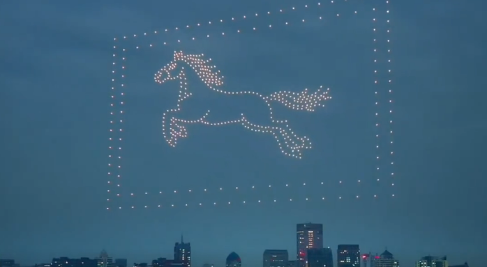夜幕降临,无人机编队变幻出马年主题光影秀,科技与艺术的结合,绝对不容错过!