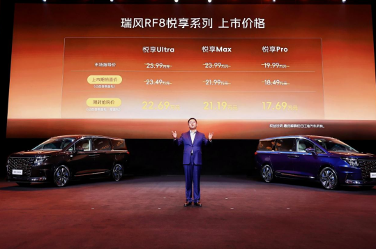 此次上市的瑞风RF8悦享系列共推出三个版本:悦享Pro版限时抢购价17.69万元,悦享Max版限时抢购价21.19万元,悦享Ultra版限时抢购价22.69万元。同时,瑞风为首批用户准备了至高价值70888元的7重尊享购车大礼,并为老车主提供免费升级原厂车钥匙或HiCar智慧车生活、1666元升级原厂NVH静音包的双重专属感恩权益。