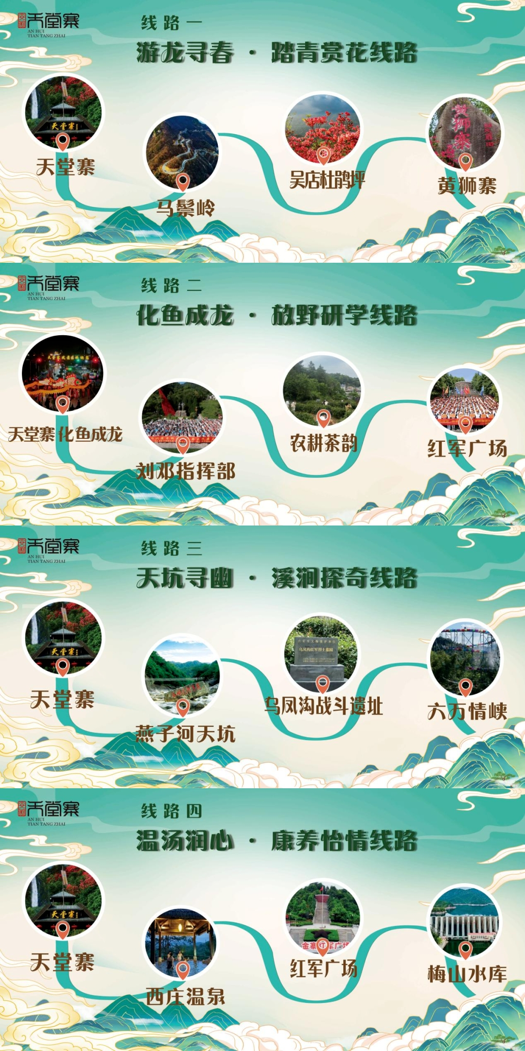 天堂寨素有“华东最后一片原始森林”美誉,春日植被繁茂、飞瀑流泉、负氧离子充沛,是短途踏青、疗愈度假的优选目的地。为满足多元出游需求,景区精心规划七大春季精品旅游线路,串联马鬃岭、燕子河大峡谷、六万情峡等周边热门景点,覆盖全人群游玩需求。