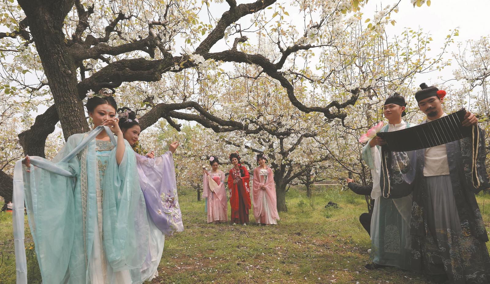 “梨花的白,是诗意的白,是美学的白……”“一朵白衔着一朵白,从云深处坠落;万里飘零,优雅地栖落在墨挑的枝丫……”“剥落身上的残冬,找到那棵一直等待我的树,那儿,春天已长满枝头……”万亩梨园中,梨花诗会以诗会友,吸引了众多游客。
