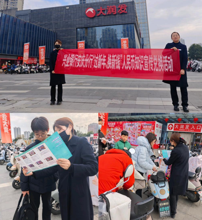 兴业银行安庆迎江支行在大润发购物中心前广场设立人民币知识宣传服务点,工作人员手持醒目的红色横幅—“兴业银行安庆分行‘过新年、换新钞’人民币知识宣传兑换活动”,现场提供新钞兑换、残损币回收、人民币防伪特征讲解等一站式服务。市民驻足咨询踊跃,工作人员耐心解答关于新版人民币水印、光彩光变数字、安全线识别等实用知识,并发放《人民币知识小手册》,助力公众提升识假辨伪能力,安心过好“洁净年”。