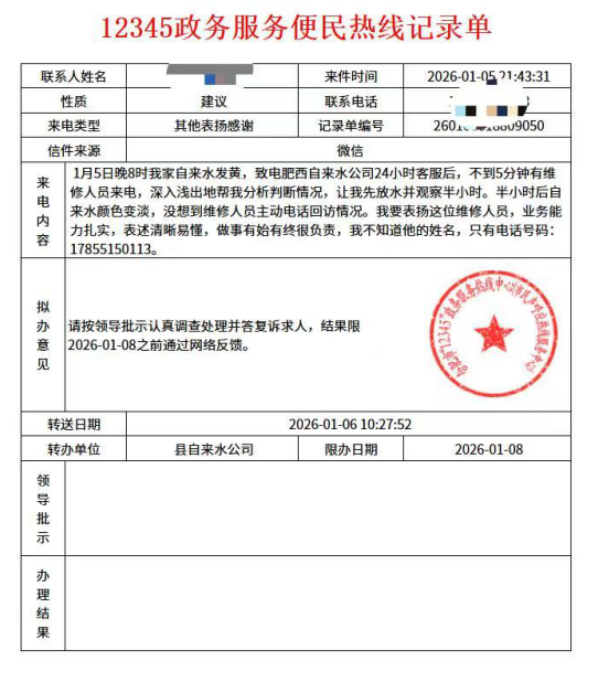 整个服务过程,从快速响应到耐心解释,再到主动跟进,每个环节都彰显着高效、专业且充满温度的服务理念。这宛如一股暖流,在冬夜中悄然流淌,温暖了用户的心。用户被这份真诚与敬业深深打动,于当夜致电合肥市12345政务服务便民热线,要求表扬这位不知名的维修人员。