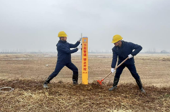 面对原水管道穿越农田、林地等复杂地形,且冬季霜冻、施工环境恶劣等多重挑战,原水公司“源头红盾”党员先锋队以“顶霜踏勘、昼夜推进”的实干作风,徒步开展全线标识桩点位精准定位。他们手持GPS设备,沿管线逐段摸排、逐点放样,晨起踏霜而作、夜晚披星而归,历经29天连续奋战,累计完成1500个标识桩/牌的敷设安装。一条由桩点串联而成的“地面坐标线”清晰呈现,为原本“看不见”的地下管线穿上了醒目的“护身符”,构筑起一道绵延百里的立体安全屏障。