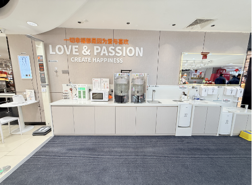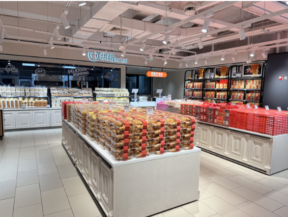 门店购物环境同步升级,取消强制动线,大幅拓宽购物通道。货架设置更为人性化,中岛货架高度由原来的2-2.4米统一调整为1.6米,层数也从8-9层精简至5-6层,营造出开阔通透、轻松自由的漫步式购物空间。烘焙区设立专馆,并增加自助收银机台,方便顾客快速结账。