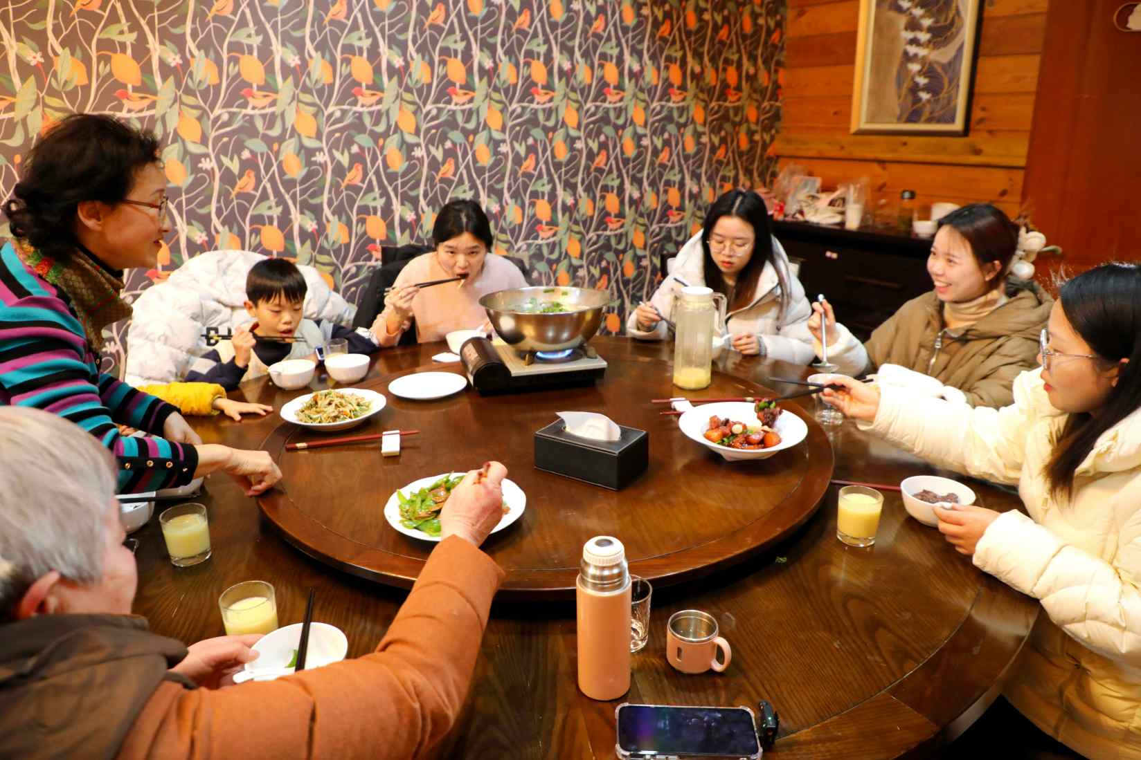 本次宰杀的年猪,是当地农户散养的黑猪,肉质紧实鲜嫩,膘白似玉、肉红如玛瑙。晌午时分,一桌全猪特色宴鲜香满溢:爆炒猪肝嫩爽入味,刨汤肉软糯不腻,红烧肉油润酥烂,道道佳肴皆是地道乡味,再搭配营地菜园现摘的时令鲜蔬,每一口都是原生态的鲜美,围桌而坐的游客们举杯畅食、大快朵颐。“在城里很难感受到这么浓厚的年味,仿佛回到了小时候在乡下过年的日子。” 游客张女士的感慨,道出了现场众多游客的心声。
