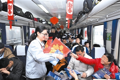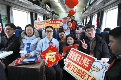 招聘企业为车厢旅客发放宣传手册