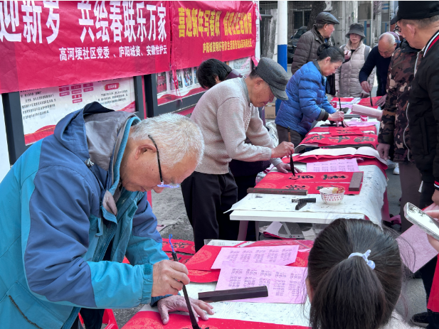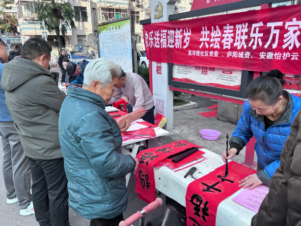 为积极营造健康文明、积极向上、温馨和谐的新春氛围,近日,合肥市庐阳区双岗街道高河埂社区党委联合工会、安徽怡护云康养有限公司在辖区文化广场开展了“善行双岗 让爱飞翔”服务类社会救助品牌项目——我们的节日“欢乐送福迎新岁,共绘春联乐万家”写春联送祝福活动,为辖区居民送去新春祝福,增添新春喜庆氛围。