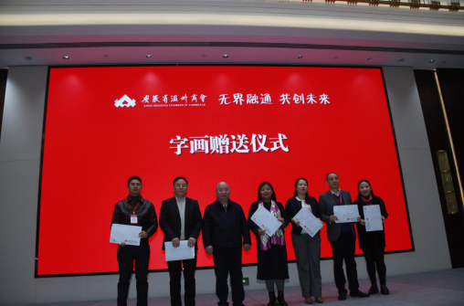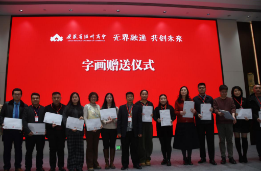 活动现场兼具产业高度与文化温度。“墨契同心 商略致远”——安徽省温州商会党支部书记陈尚发与执行会长陈光华为安徽省各异地兄弟商会、安徽国际徽商交流协会赠送由国家一级书法家、省政府参事室特约研究员方中传教授创作的作品,以笔墨传情、以文化聚力。安徽省上海商会会长汪根生高度评价研究院成立的时代意义,以及安徽省温州商会的创新活力与高质量发展模式,盛赞温商精神的时代价值与商会工作的标杆意义。