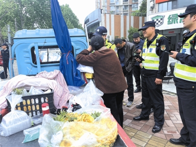 在颍上路与临泉路交口西南角,观摩活动现场正进行一场流动摊点整治。3名摊贩占道经营,影响通行并存在安全隐患。执法人员抵达后,第一时间亮明身份、讲明政策,一名队员蹲下身,耐心向水果摊主讲解市容管理规定及占道风险。完成劝导后,依法依规作出相应行政处罚,全程规范有序。一旁的城市管理观察员也主动上前,以普通市民身份轻声劝导:“我们理解做小生意的不易,但这里靠近斑马线,人车拥堵,规范经营,生意才会更好。”真诚沟通打消了摊主顾虑,对方主动收拾摊位,执法人员协助将推车移至便民疏导点,路面迅速恢复畅通,实现了执法力度与温度的统一。