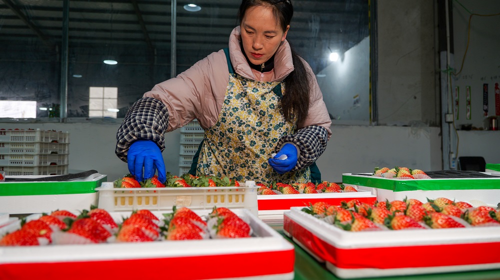 在麟果果草莓分拣中心,工人们正忙着将采摘的草莓进行分拣。周虹光 摄