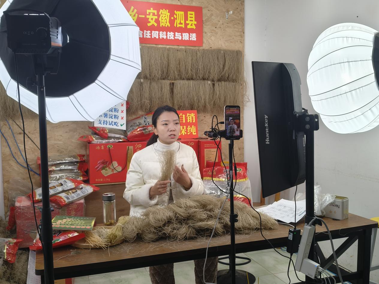 傍晚五点,夜幕降临,泗县运河街道网周村新时代文明实践直播间里已亮起灯光。村党总支书记时昌跃正做着开播前的最后准备,他熟练地调整摄像头与补光灯,将一束束晶莹剔透、整齐排列的手工粉丝郑重地摆放在镜头前。再过一会儿,网周村的晚间直播就要开始了。