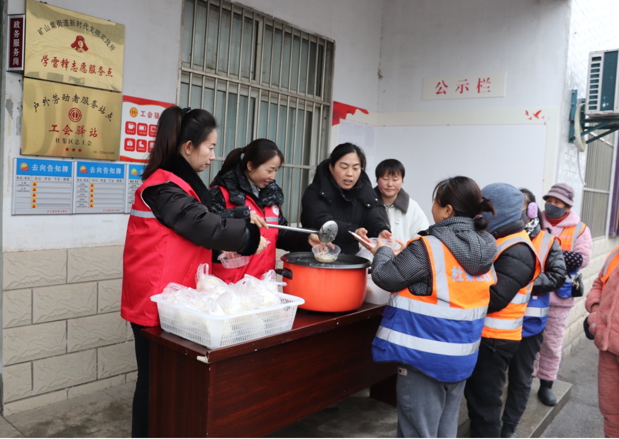 为切实关爱户外劳动者,弘扬腊八传统民俗,1月26日清晨,淮北市杜集区矿山集街道工会联合新时代文明实践所,在街道工会驿站开展“情暖腊八 关爱同行”主题活动,为一线环卫工人送上腊八粥及爱心早餐,切实传递工会组织的暖心关怀。