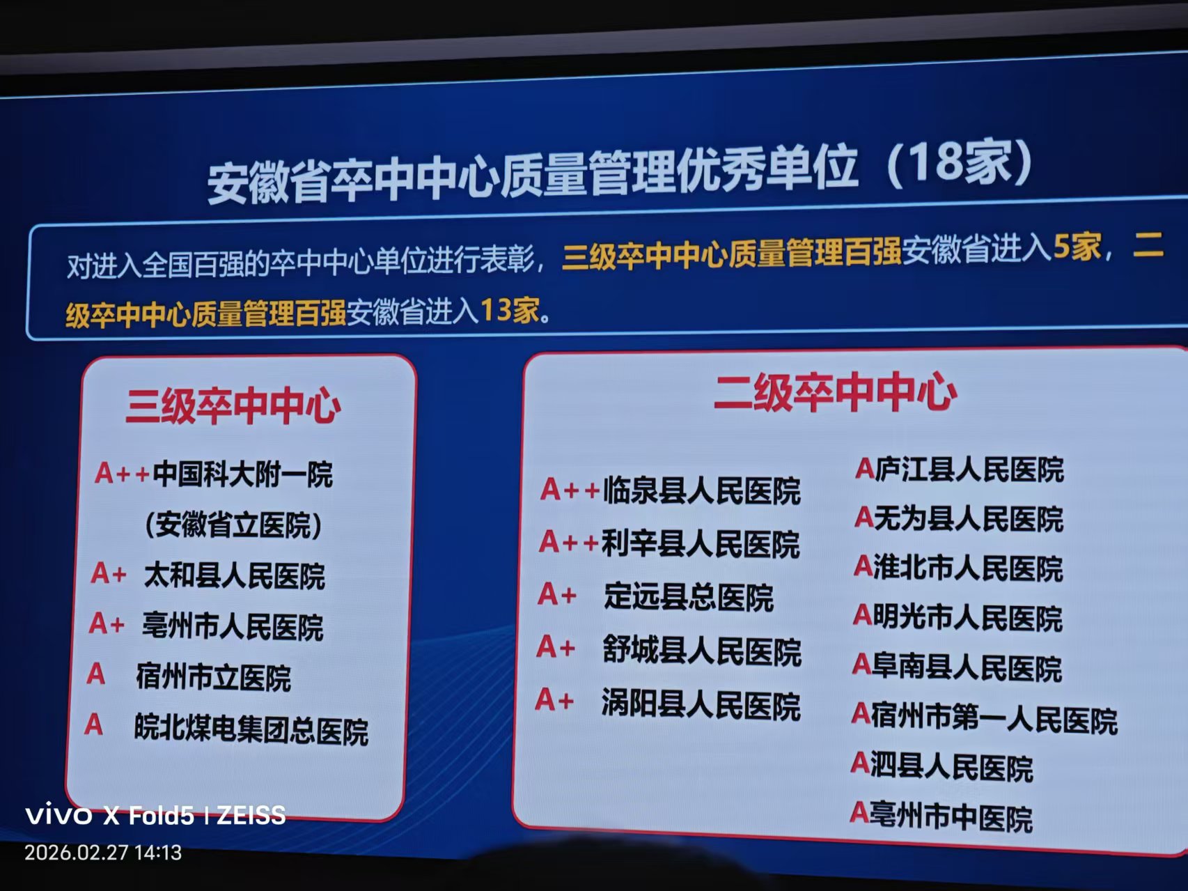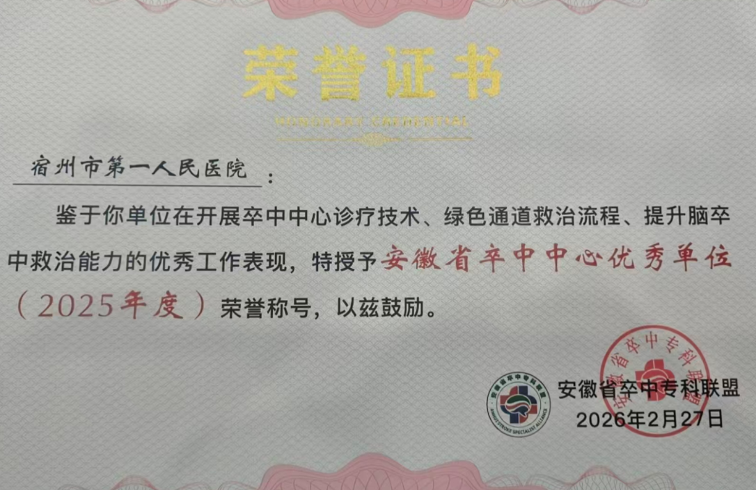 会上,宿州市第一人民医院凭借规范的质控管理、高效的急救救治能力、完善的全周期防治体系以及5G移动卒中单元建设等突出成效,被授予安徽省卒中中心优秀单位称号,标志着医院卒中中心建设与诊疗服务质量再次获得省级权威认可。
