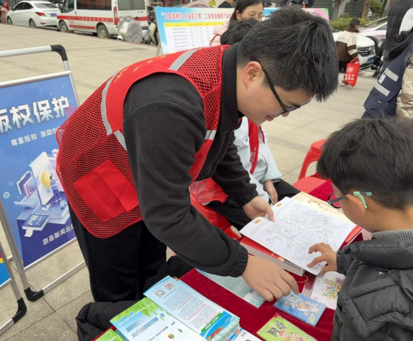 活动现场,工作人员设立了主题宣传展台,向过往居民发放版权保护和“扫黄打非”宣传手册。展台上特别陈列了一批已完成版权登记的文创产品,涵盖设计作品、手工制品等类型,志愿者结合实物向居民介绍:“像这样的原创设计,从完成创作之日起就应当及时进行版权登记,这是保护自己劳动成果最有效的方式。”通过“看得见、摸得着”的展示,让版权保护意识更加深入人心。同时,展台还摆放了正版与盗版书籍的对比样本,志愿者通过实物教学,向居民和青少年细致讲解如何从印刷质量、装帧工艺、定价标识等方面辨别盗版图书,让大家直观认识到盗版制品对身心健康和创作者权益的危害。