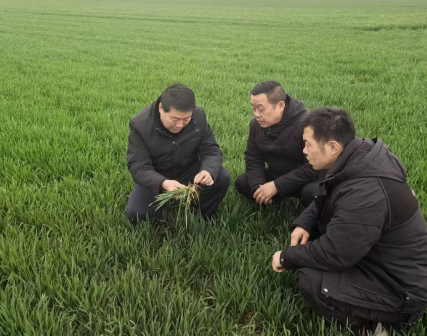 在马场村种粮大户翟洪刚的麦田里,周峰弯腰拨开嫩绿的麦苗,仔细查看根系发育、分蘖数量与叶片长势,随手拔起一株健壮麦苗现场对比讲解:“你这块麦田苗情整体不错,根系粗壮、分蘖充足,是稳产高产的好底子。”他一边查看,一边细致询问:“返青肥追施到位了吗?除草剂、纹枯病和茎基腐病防控药剂有没有及时喷施?”一句句贴心叮嘱、一项项技术提醒,让翟洪刚听得认真、记得明白。
