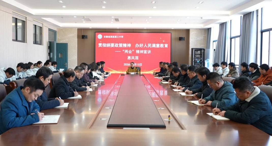 在安徽省宿州市泗县第三中学,全国人大代表、泗县三中副校长惠凤莲结合自身参会经历和基层教育工作实际,向全体教师原汁原味传达全国两会精神,重点围绕今年政府工作报告提出的推进教育强国建设、实施新时代立德树人工程、推动教育公平与质量提升、加强县域普通高中建设等核心内容,进行了全面细致的宣讲。