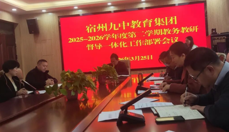 为深化教育教学改革,破解教研形式化难题,推动教学与教研深度融合,3月25日下午,宿州九中教育集团召开2025至2026学年第二学期教务教研督导一体化工作部署会。集团党委书记、校长张翔出席会议并讲话,集团副校长王奇主持会议,集团各校区教务、教研、督导相关负责人参加会议。