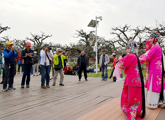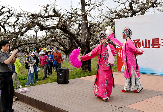 “花开四季皆应景,阮妈妈,你听我呀报一报花名。正月里开迎春花少叶盛……”国家级非遗项目省级传承人王敏、宋雪梅身着鲜艳戏服,水袖轻扬,一曲四平调《花为媒·报花名》字正腔圆、韵味醇厚。紧接着,《站在寿堂喜气升》的婉转唱腔在梨园中回荡,将传统戏曲的独特魅力展现得淋漓尽致。来自江苏徐州的游客李女士激动地说:“我是第一次现场听四平调戏曲,唱腔里带着梨乡的烟火气,比在电视上听更有味道!”