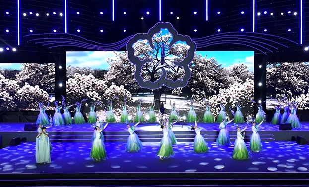 文艺演出精彩纷呈,非遗集中亮相的《薪火相传 梨花颂》,将蓝花印染、梨木雕刻、砀山烙画等十余项千年非遗搬上舞台。《琼枝舞韵 梨花仙》唯美登场,琼枝舒展,新绿萌动,身着华服的舞者化作梨花仙子,乘风翩跹,牧笛声声悠扬,漫天飘落的宛若飞雪,诉说着生命最温柔的情愫。《云水春波 梨花海》将意境推向高潮。古筝清音如清泉流淌,舞者云袖舒展,电子大屏里花海翻涌着琥珀色流光,动静相宜、刚柔并济。