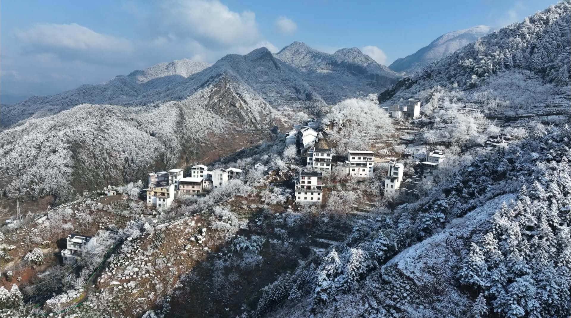 受寒潮天气影响,黄山市歙县高海拔山区金川乡搁船尖迎来新年首场降雪。2026年1月2日,雪后初霁,搁船尖裸露的灰褐色石脊与皑皑白雪交相辉映,山谷沟壑间云海翻腾,层层山峦与徽派村落被白雪覆盖,美景如诗如画。