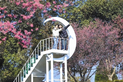3月12日,安徽省黄山市徽州区谢裕大茶博园,游客在欣赏缤纷的樱花茶园美景。春日时节,安徽省黄山市徽州区谢裕大茶博园新茶吐绿,一树树樱花烂漫绽放,点缀在层层叠叠的茶园间,红绿相映,美不胜收。
